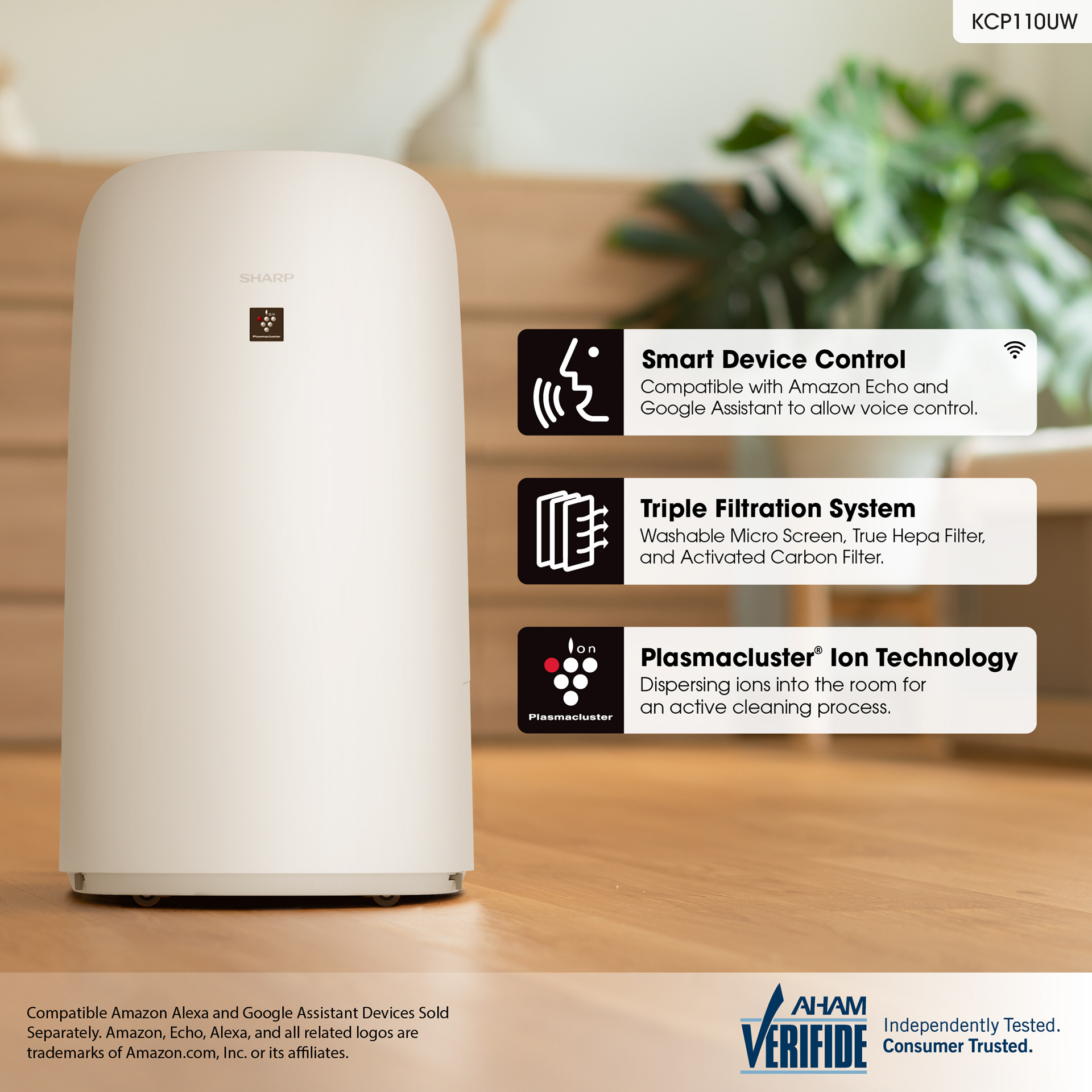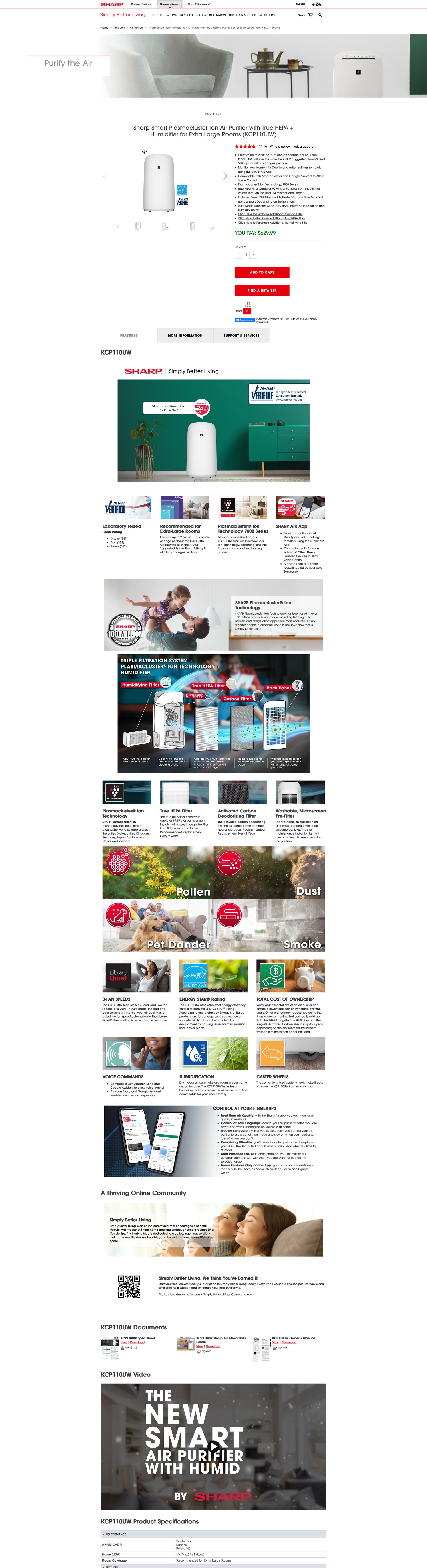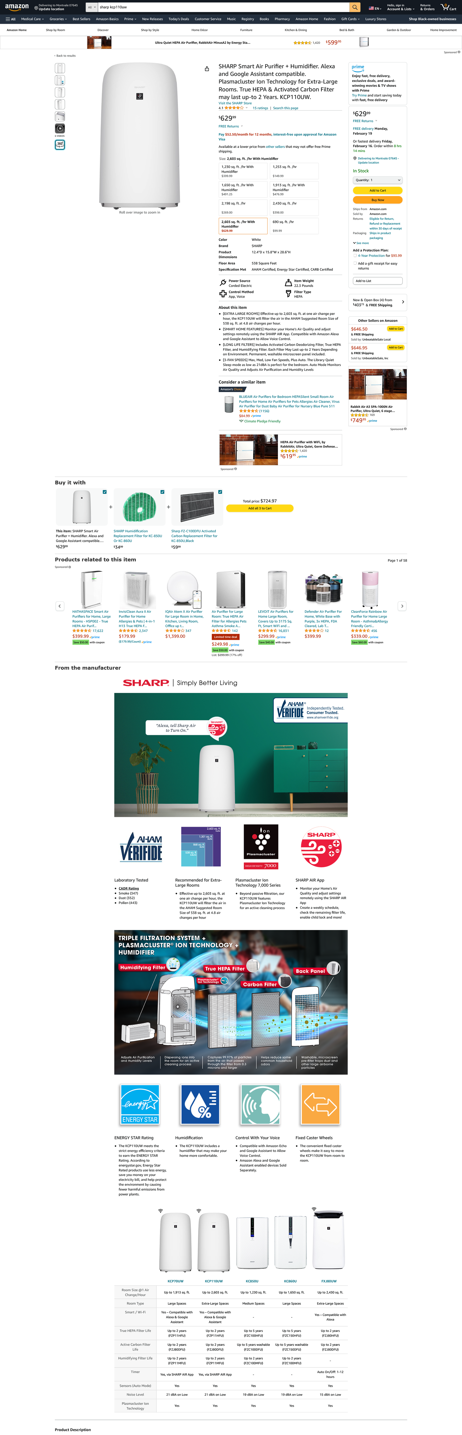 Sharp Smart Plasmacluster Ion Air Purifier with True HEPA + Humidifier for Extra Large Rooms (KCP110UW)