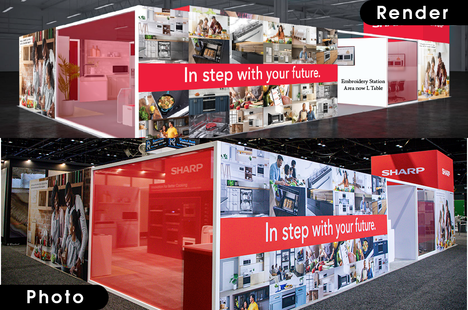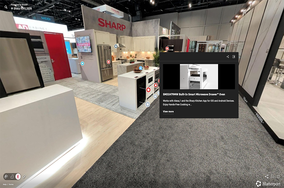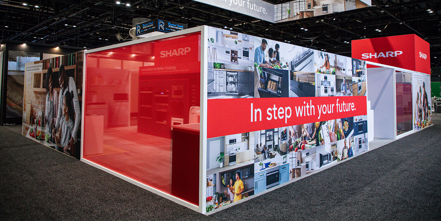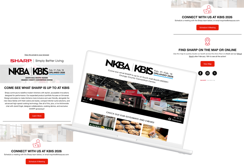 For KBIS 2026, the challenge was to deliver a booth and brand experience unlike anything Sharp had previously executed, all while launching the new global slogan, “In Step With Your Future,” under tight timelines and shifting constraints. The scope extended beyond booth design to include a live Kitchenside Chat panel, a looping brand video, pre-show marketing through landing pages, email and social campaigns, RSVP management, and Sharp’s first-ever virtual booth scan. Additional challenges included onboarding a new booth vendor, limited affordable signage options, late product additions, and frequent design changes.