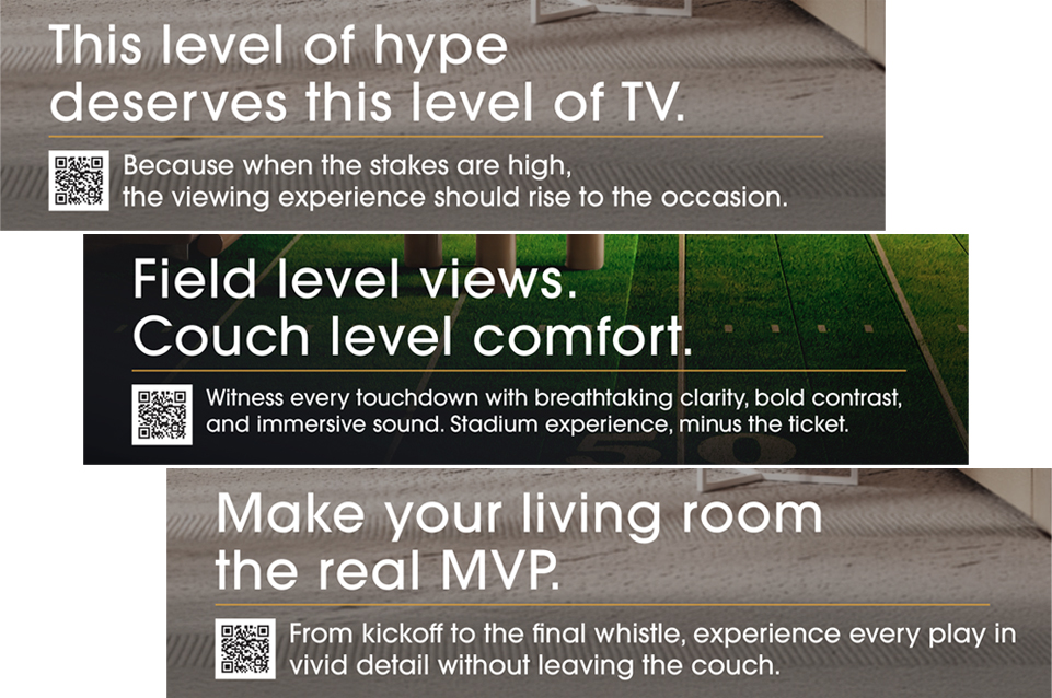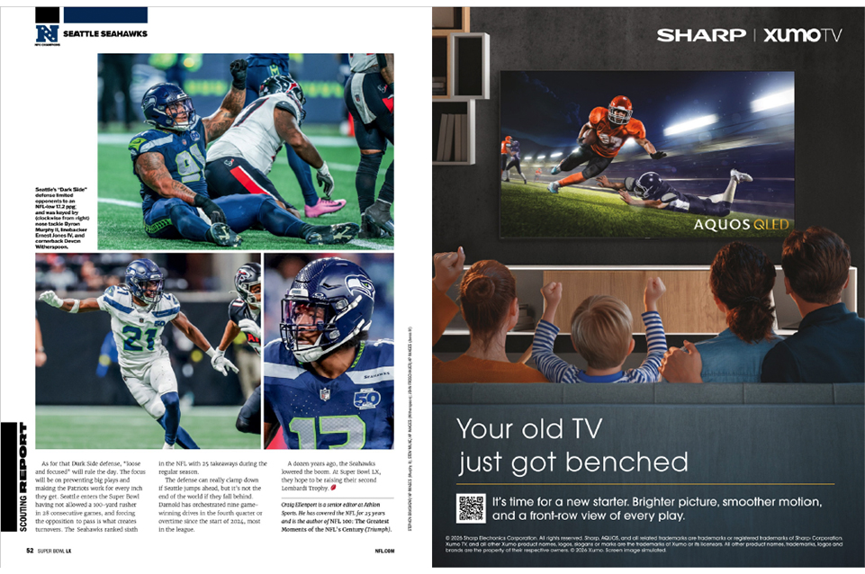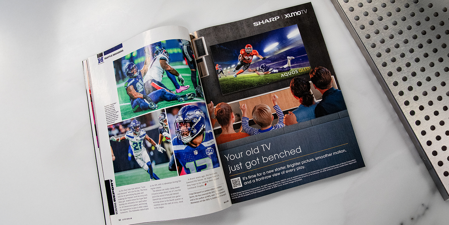 The final creative was approved and published prominently in the Super Bowl 60 Official Game Program, positioning Sharp alongside one of the most watched sporting events in the world. The placement reinforced the brand’s premium positioning in home entertainment while delivering a timely, culturally relevant message tied directly to the viewing experience of the game itself.